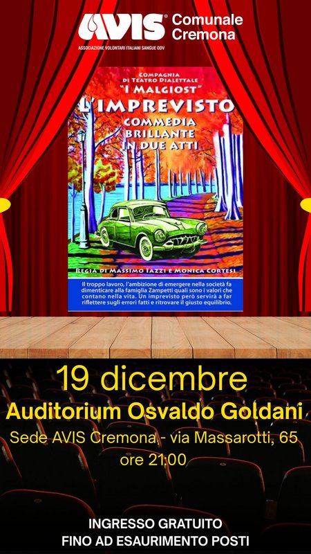 “L’IMPREVISTO” è una commedia brillante, in due atti, in dialetto cremonese, che la compagnia “I Malgiost” presenta con tanta emozione e con piacere ai donatori AVIS, in un bellissimo e tradizionale appuntamento pre-natalizio.